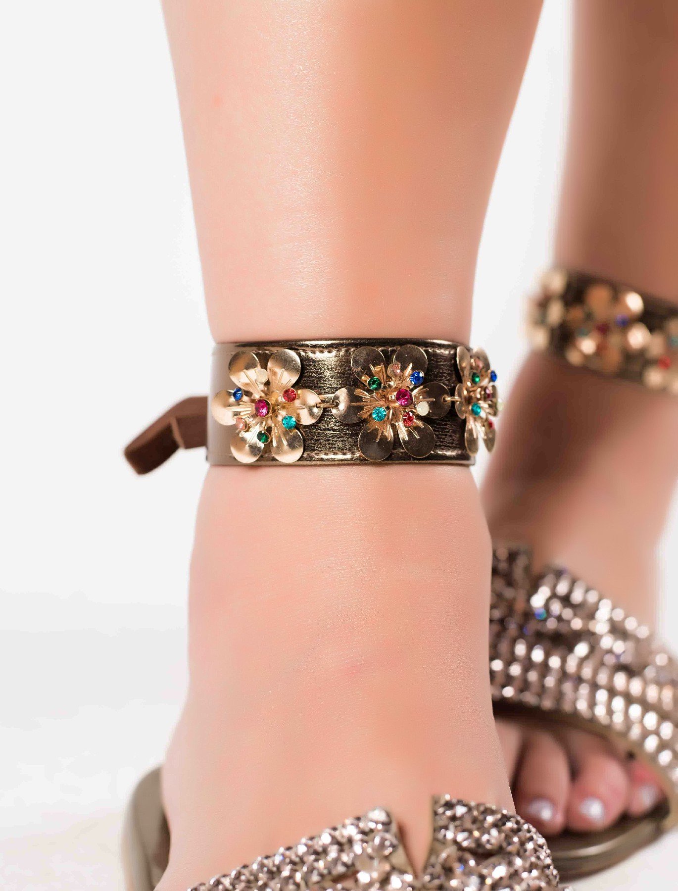 عندما يتناغم الجلد البرونزي مع ورود معدنية جذابة مطعمة بكرستال ملون، نحصل على هذه القطعة المميزة.